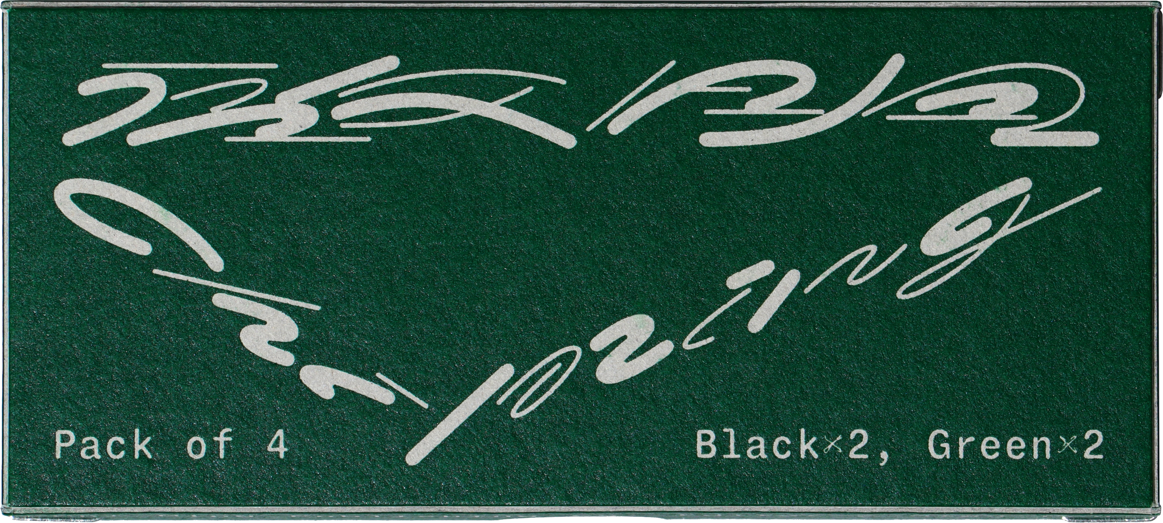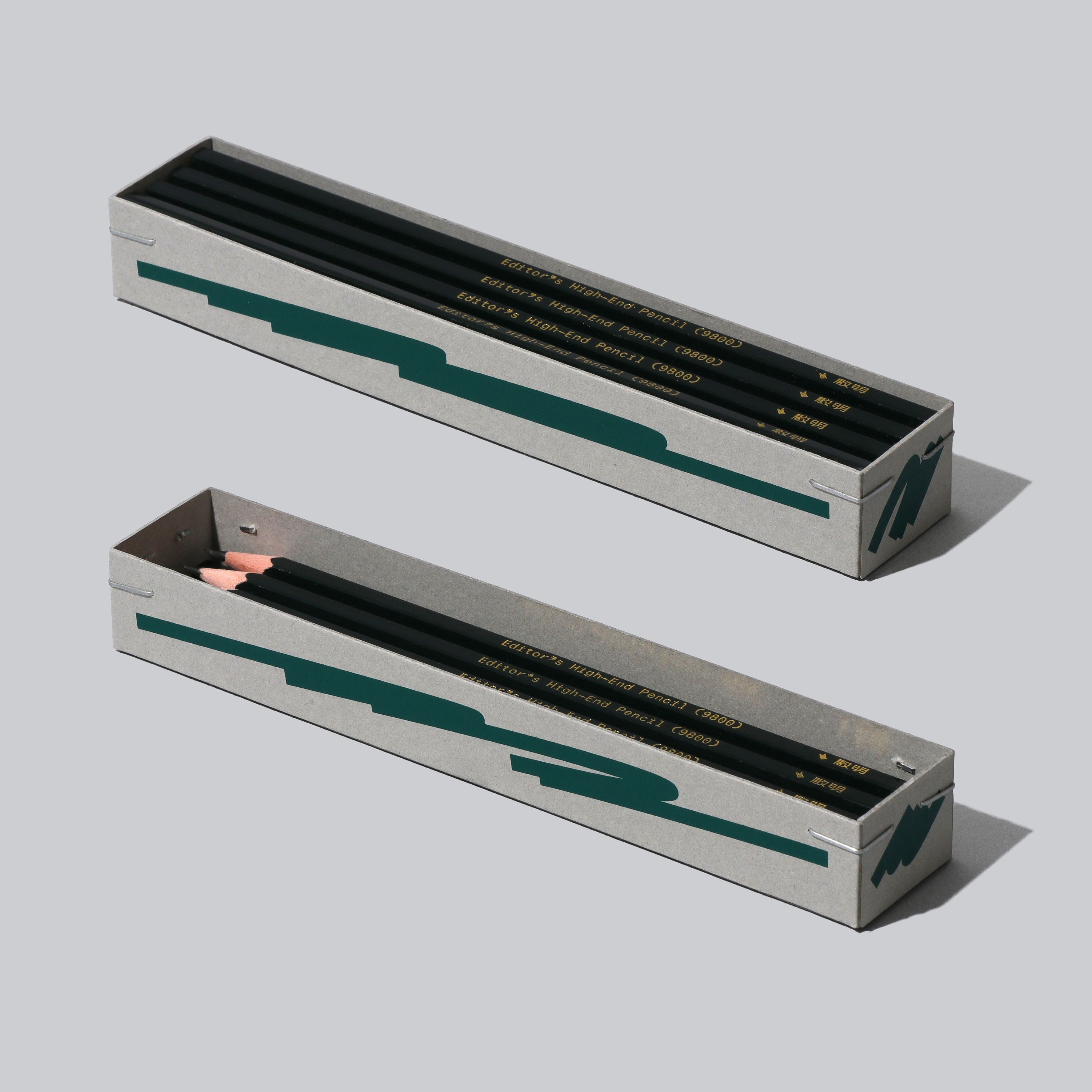 Chi Ming Editor’s High-end Pencil & Sign-Pen, designed with Sample Animal, 2023-2024. The design transforms handwritten strokes into playful graphics, encapsulating the dynamics of writing, complemented by custom typefaces that amplify the concept. The Kanji characters draw inspiration from the letterforms found on old pencil packaging. The Latin typefaces are modified versions of the open-source Fragment Mono, incorporating handwritten symbols and letterforms optimized for small print on pencils. The packaging, crafted from gray cardboard and assembled with Cornervery right-angle staples, forms a rough yet refined aesthetic. Available from Chi Ming Publishing. (Photo: Sample Animal)